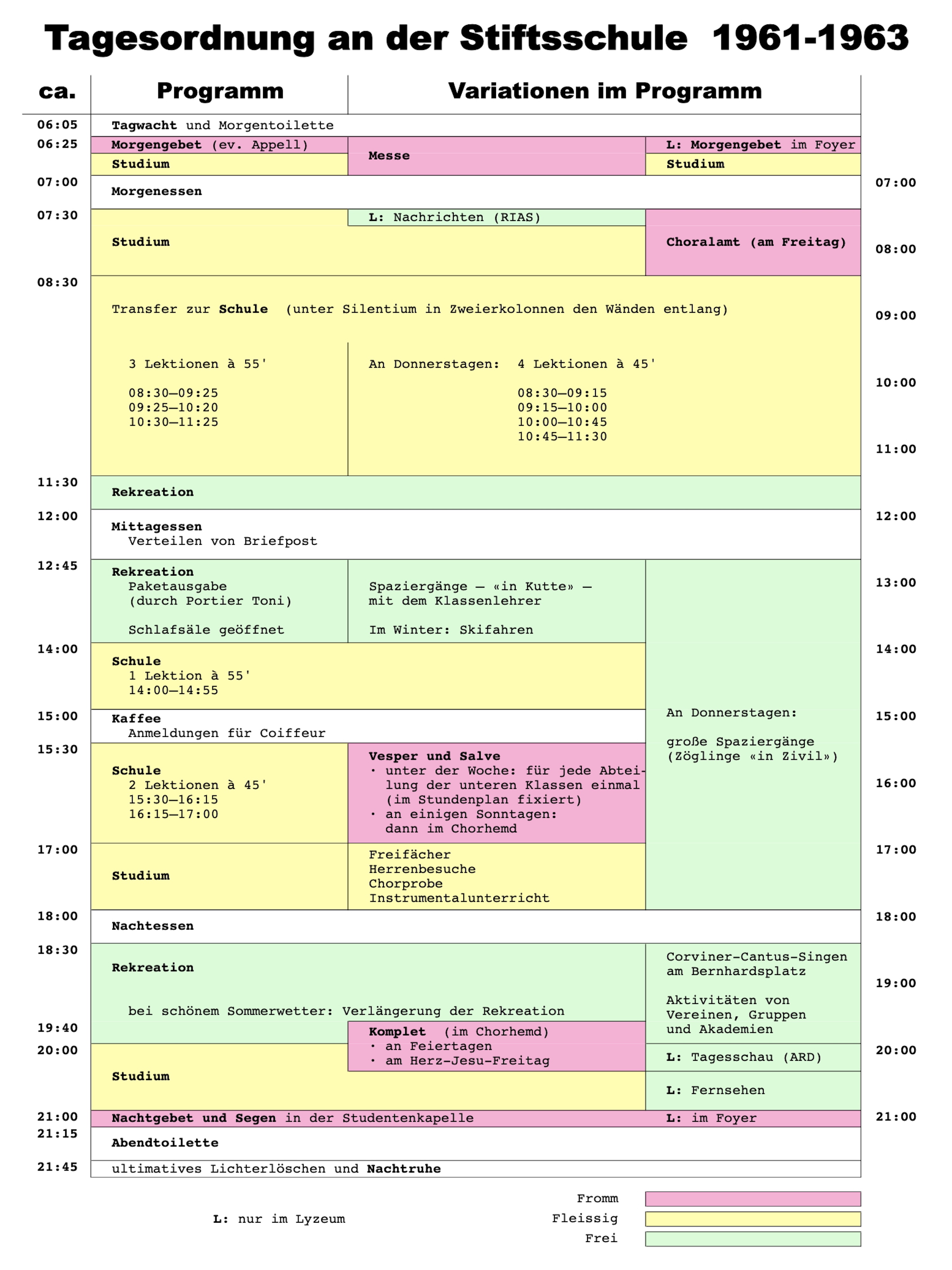 In der hier vorliegenden Stundentafel sind die Klassen 1 bis 8 des Klassenzuges zur Matura 63 berücksichtigt (ohne Vorkurse). Die Angaben «Halb-Lektion» und «Drei-Viertel-Lektion» darf man nicht allzu wörtlich deuten! |